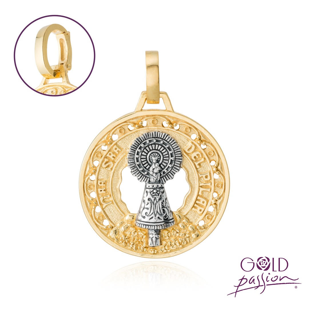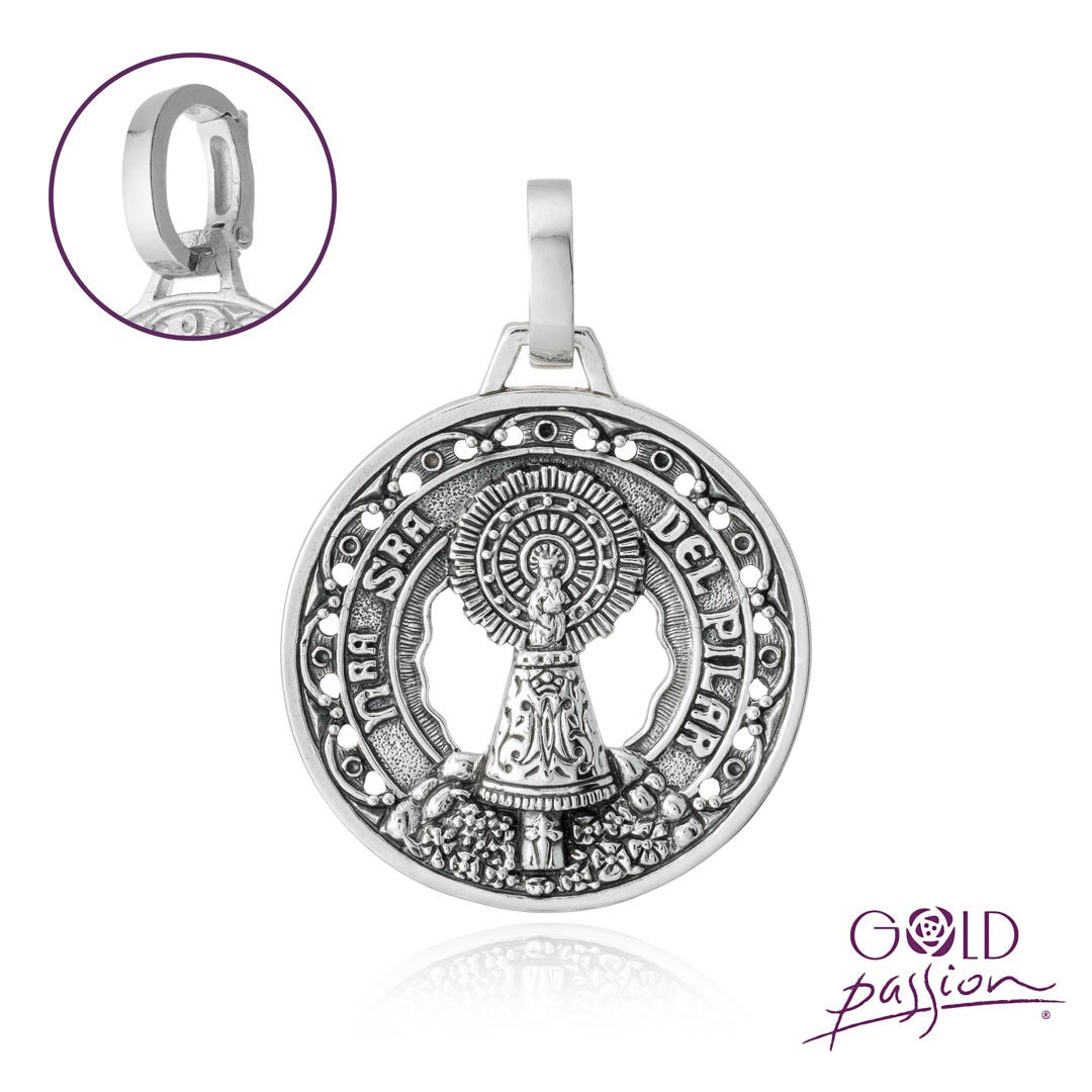 Medalla Virgen del Pilar, fabricada en plata de 925 milésimas, tres combinaciones a elegir: plata oxidada, plata bicolor o chapada en oro de 18 quilates.